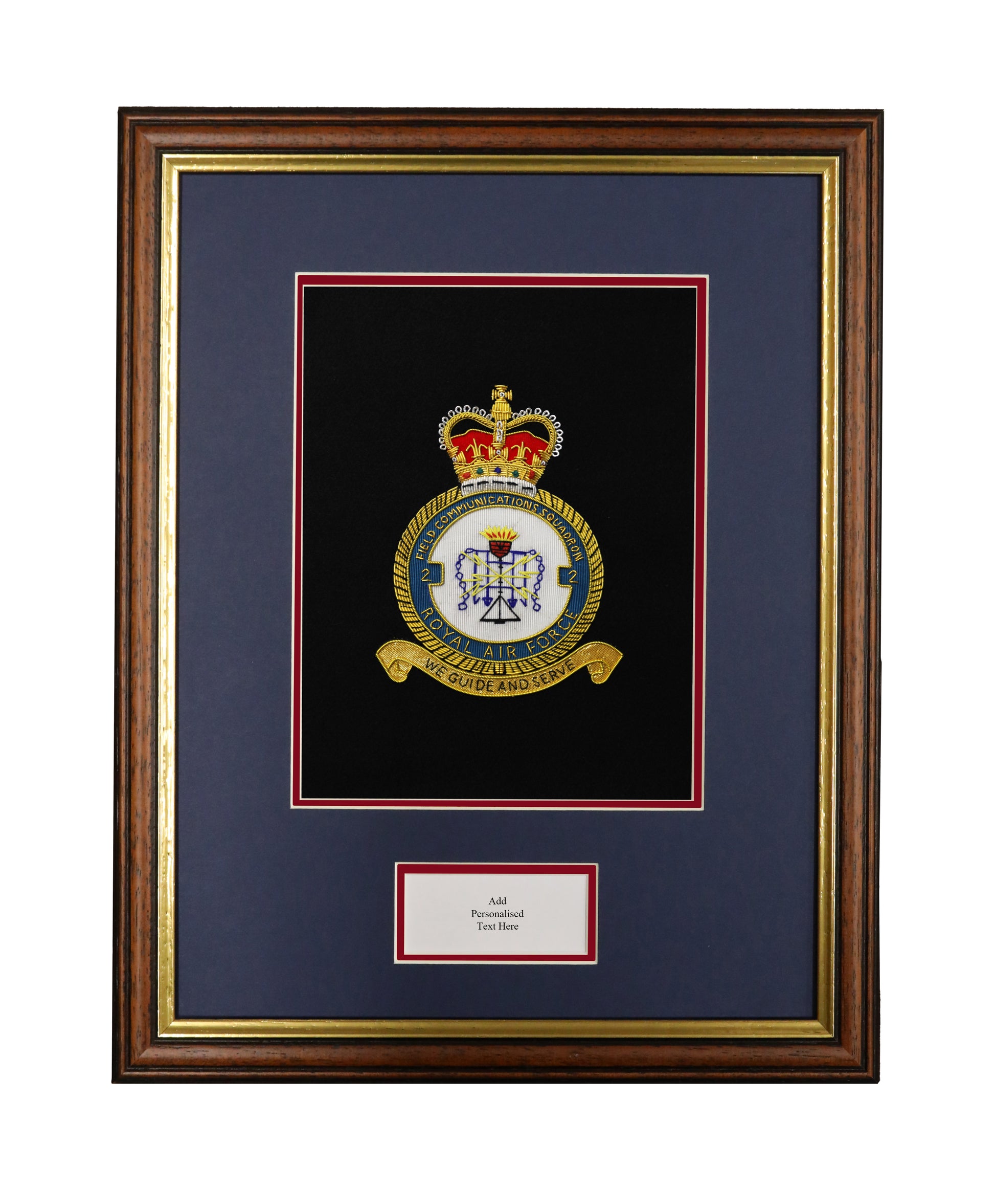 A stunning presentation piece featuring an embroidered crest plus carefully hand-picked double mount colours to represent the Royal Air Force. Framed in a traditional military Skydark frame. This presentation piece features a text box aperture to place a personalised message.