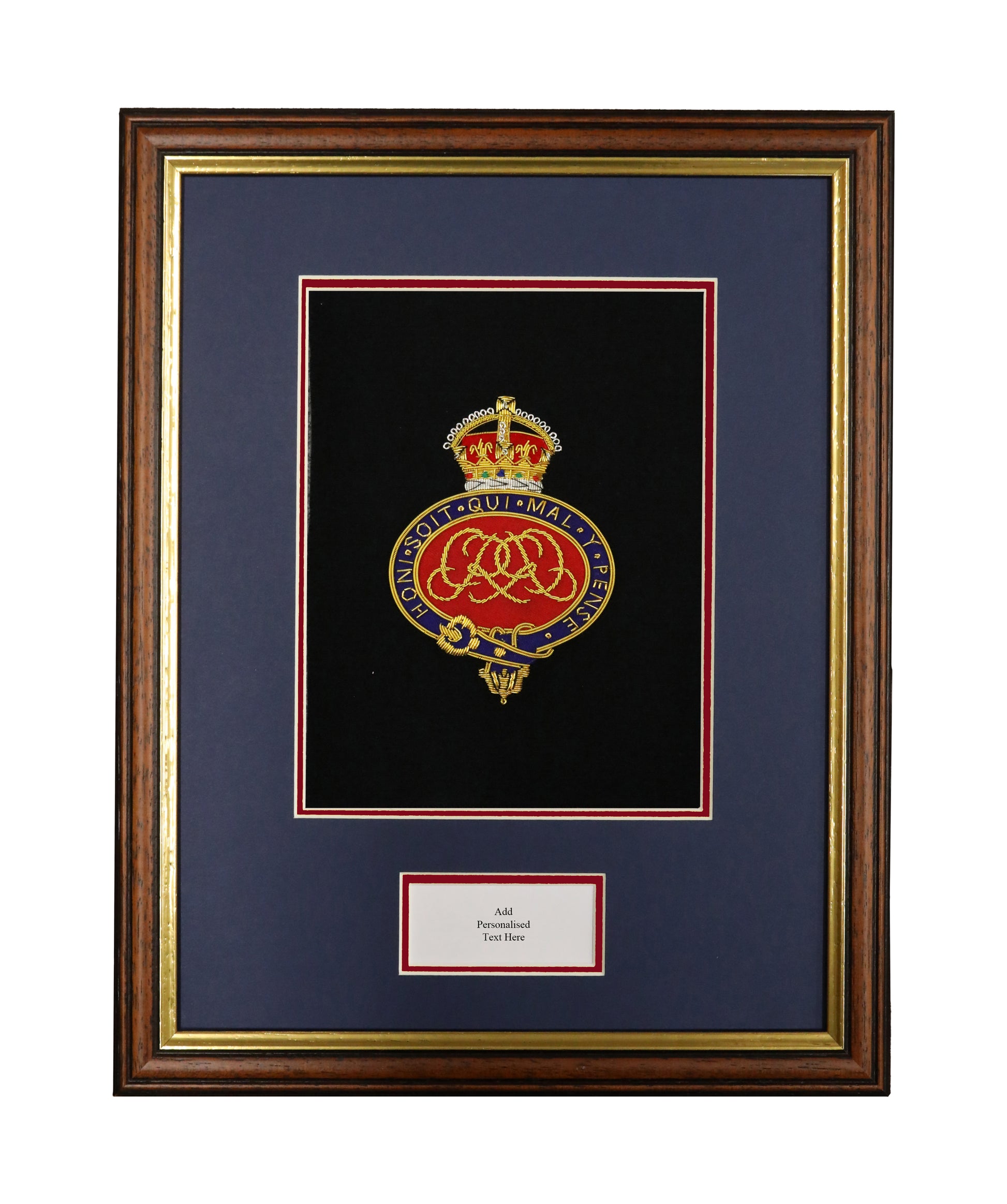 A stunning presentation piece featuring an embroidered regimental cap badge plus carefully hand-picked double mount colours to represent the regimental colours. Framed in a traditional military Skydark frame. This presentation piece features a text box aperture to place a personalised message.