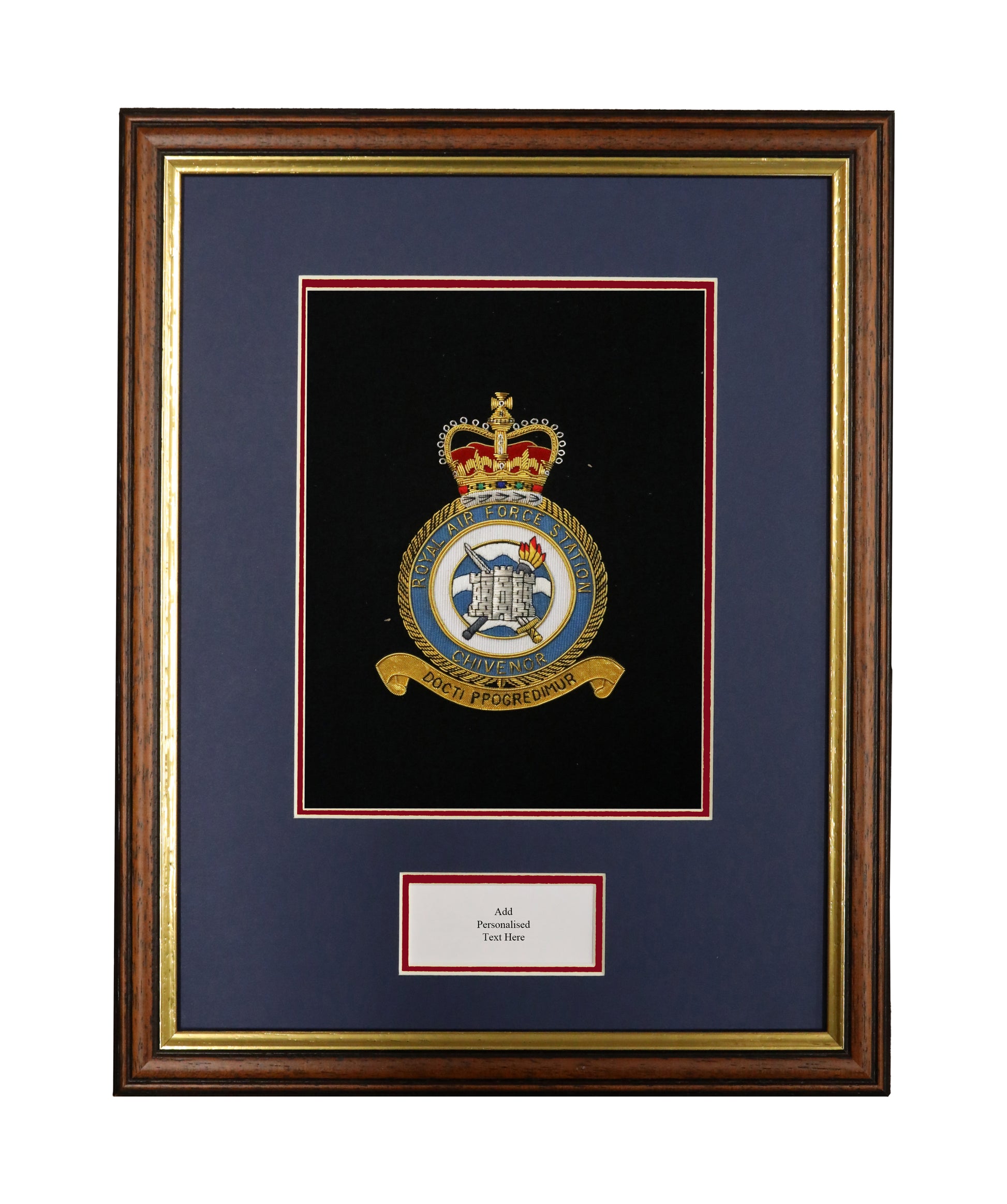 A stunning presentation piece featuring an embroidered crest plus carefully hand-picked double mount colours to represent the Royal Air Force. Framed in a traditional military Skydark frame. This presentation piece features a text box aperture to place a personalised message.