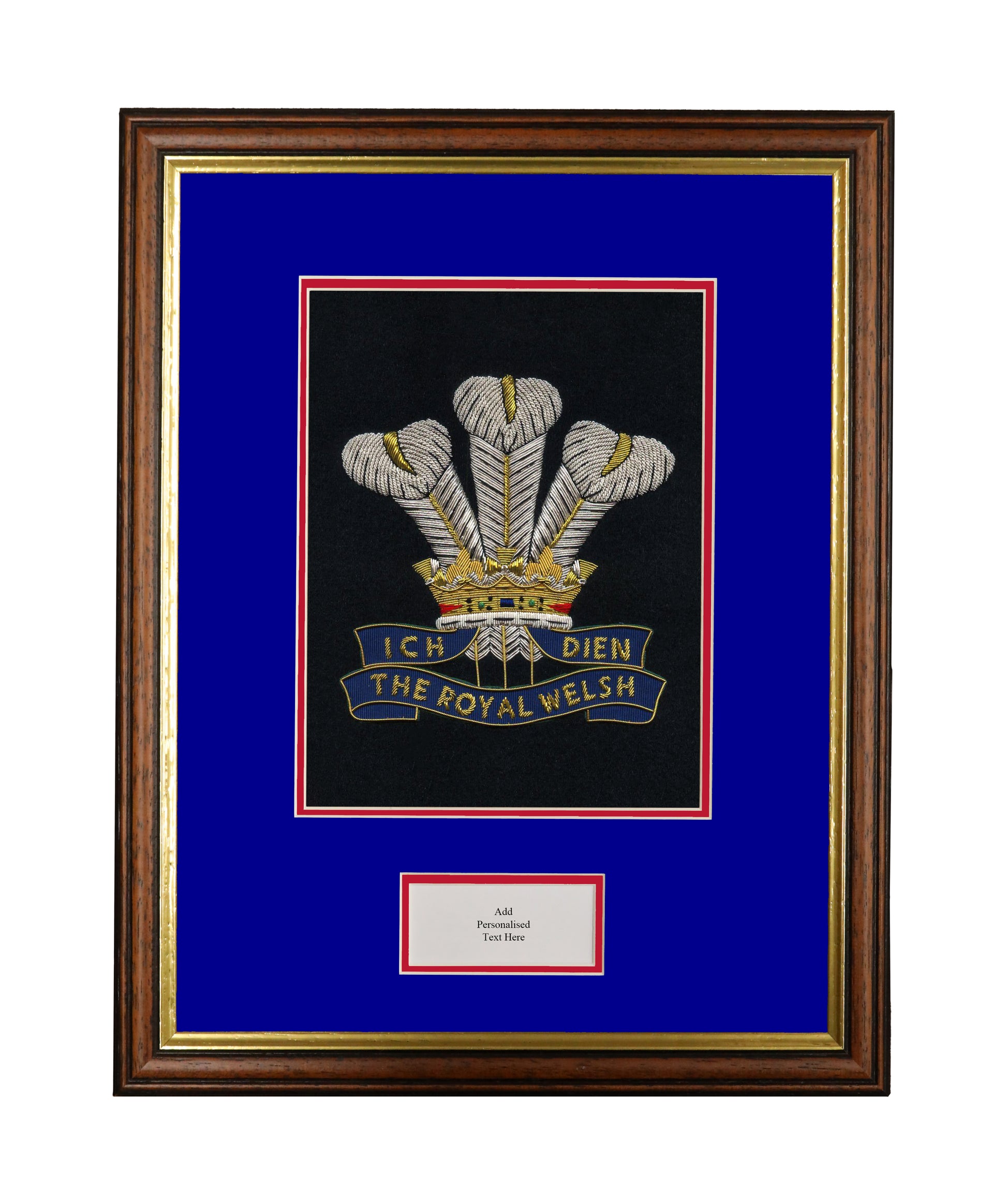 A stunning presentation piece featuring an embroidered regimental cap badge plus carefully hand-picked double mount colours to represent the regimental colours. Framed in a traditional military Skydark frame. This presentation piece features a text box aperture to place a personalised message.