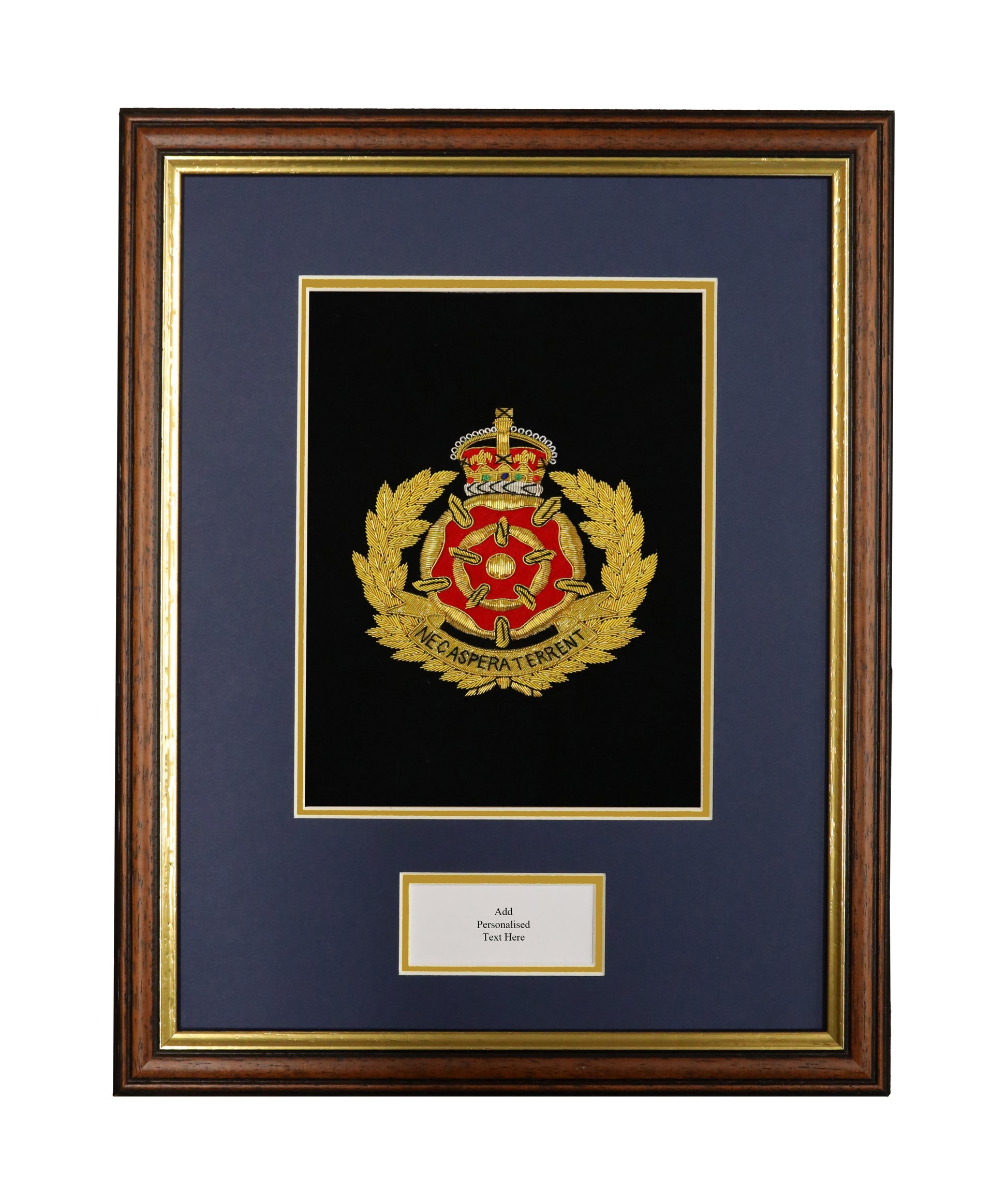 A stunning presentation piece featuring an embroidered regimental cap badge plus carefully hand-picked double mount colours to represent the regimental colours. Framed in a traditional military Skydark frame. This presentation piece features a text box aperture to place a personalised message.