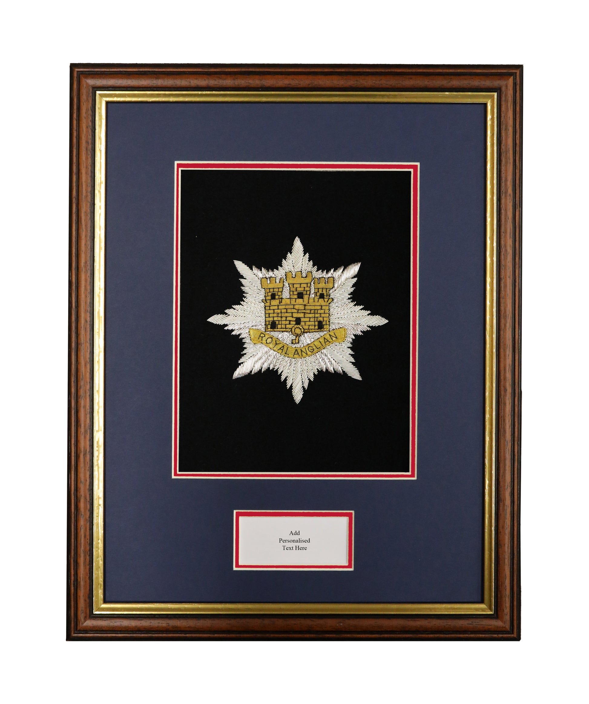 A stunning presentation piece featuring an embroidered regimental cap badge plus carefully hand-picked double mount colours to represent the regimental colours. Framed in a traditional military Skydark frame. This presentation piece features a text box aperture to place a personalised message.